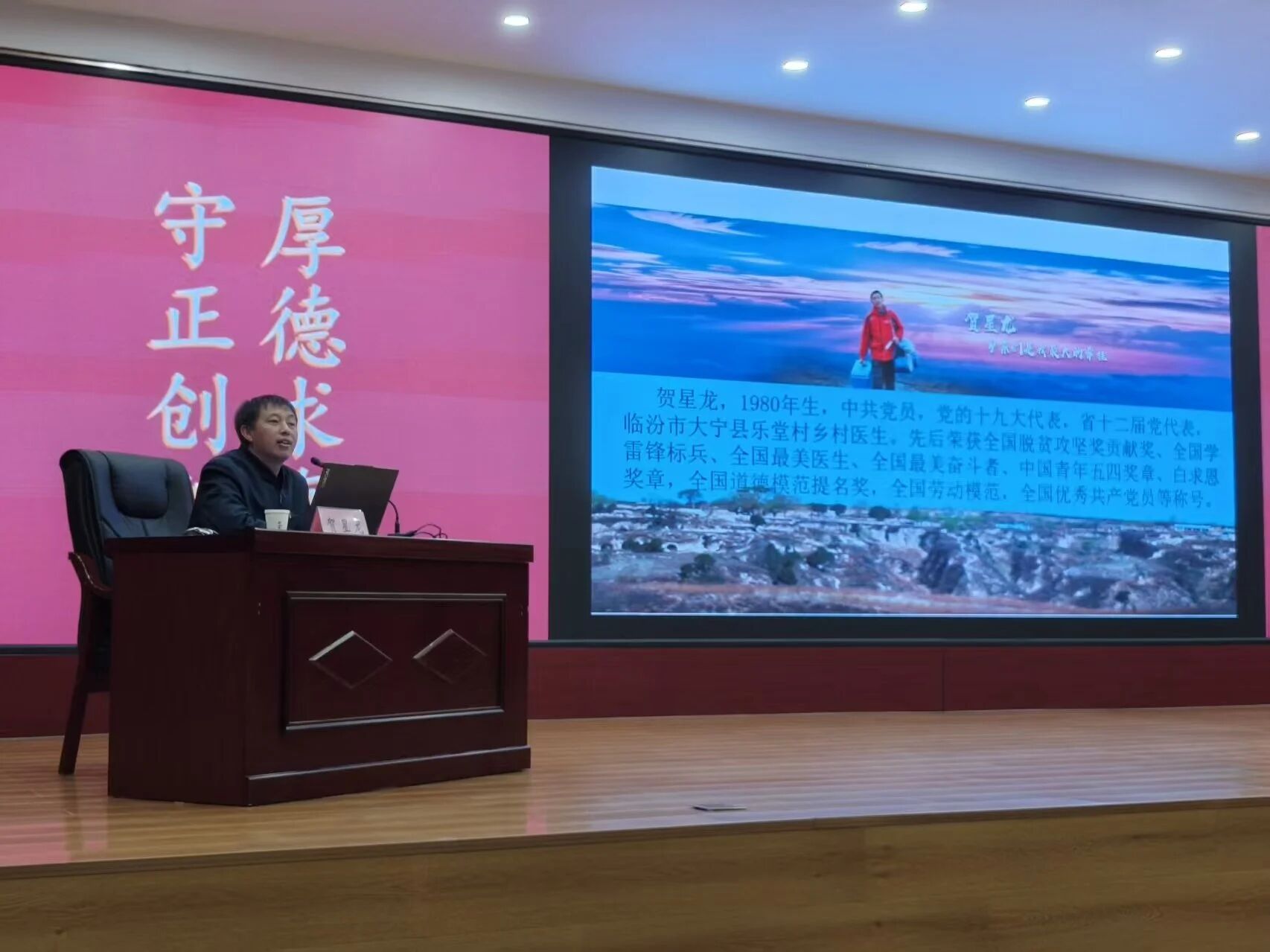 为进一步提升我院学子的职业素养,引导广大青年学子坚定理想信念、厚植健康为民情怀。3月19日晚,由乡村振兴医师学院主办,第一临床学院承办的“全国最美乡村医生”先进事迹报告会,在我校德仁堂报告厅隆重举行。本次报告会邀请到党的十九大代表、省十二届党代表,临汾市大宁县乐堂村乡村医生贺星龙作专题分享,全院学生通过“线上+线下”的方式进行聆听。