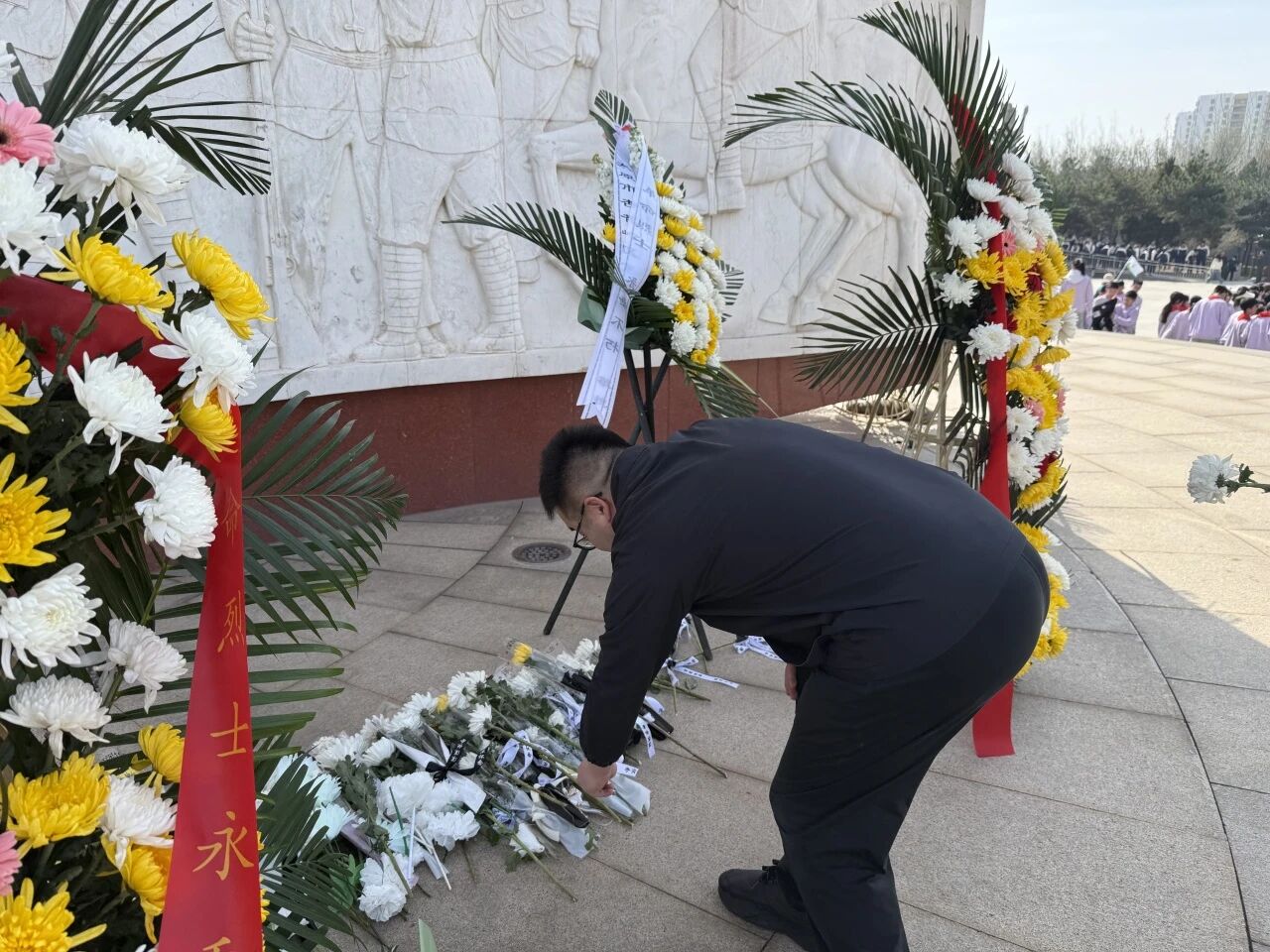 祭扫仪式庄重而简朴,全体人员整齐列队,肃立默哀,低沉的氛围里,是对革命先烈最深切的缅怀与最崇高的敬意。我们缓缓走上前,向烈士纪念碑敬献鲜花,一朵朵洁白的黄菊,寄托着我们对先烈的追思,也象征着先烈们纯洁无瑕的革命信仰。默哀的片刻,我的脑海中不断浮现出先烈们奋勇冲锋、不惧牺牲的画面:他们中有正值青春年华的战士,有义无反顾投身革命的志士,在枪林弹雨中坚守阵地,在艰难困苦中不忘初心,用血肉之躯冲破黑暗,换来了太原城的黎明,换来了我们如今和平安宁的生活。